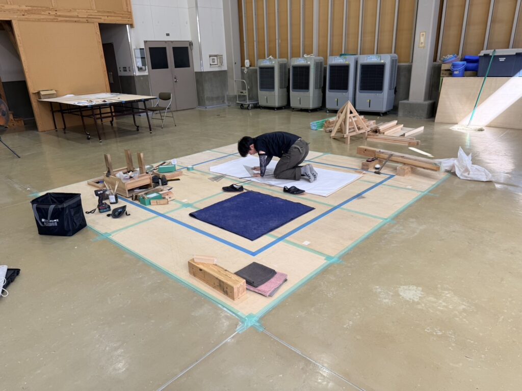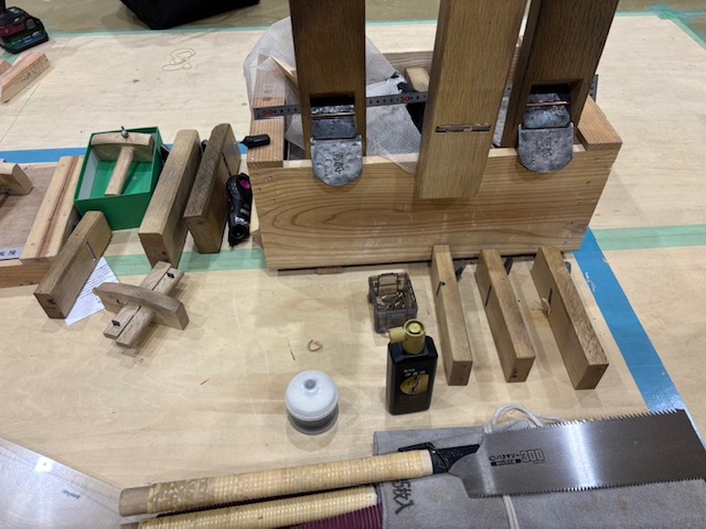 そんな中、技能五輪全国大会で敢闘賞を受賞した弊社の先輩大工の新関が、指導者として強化訓練に参加してきました。