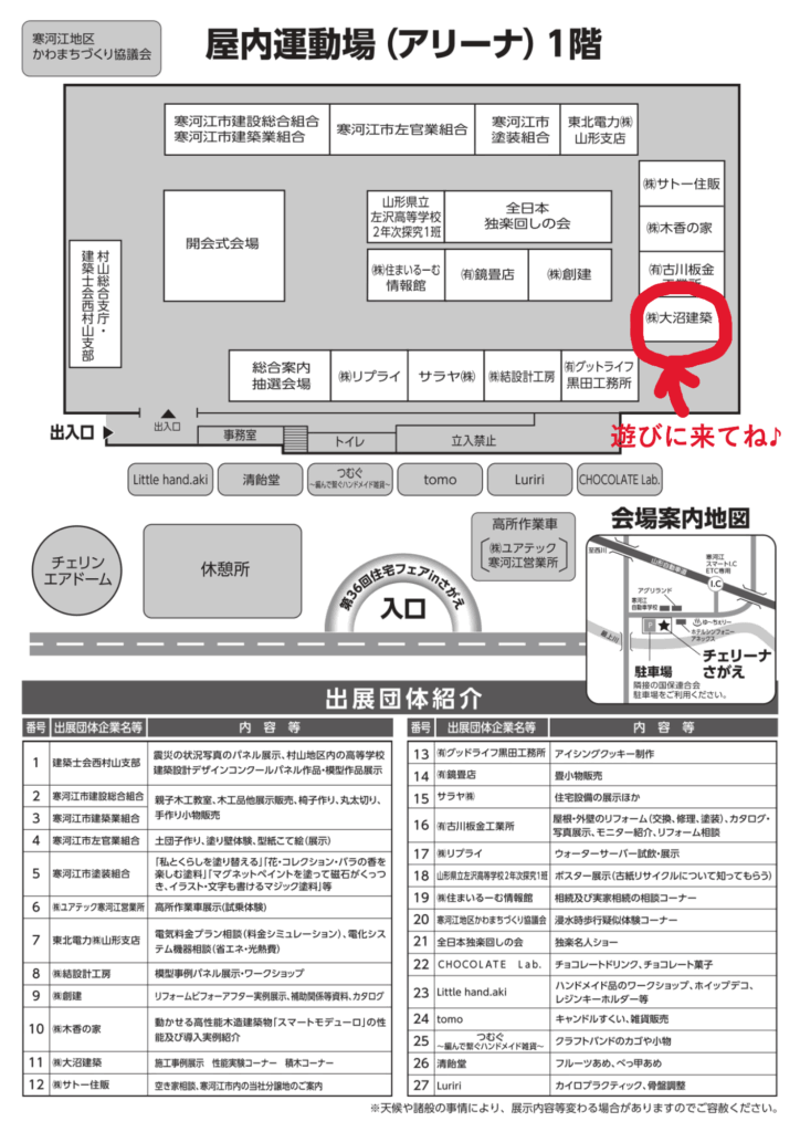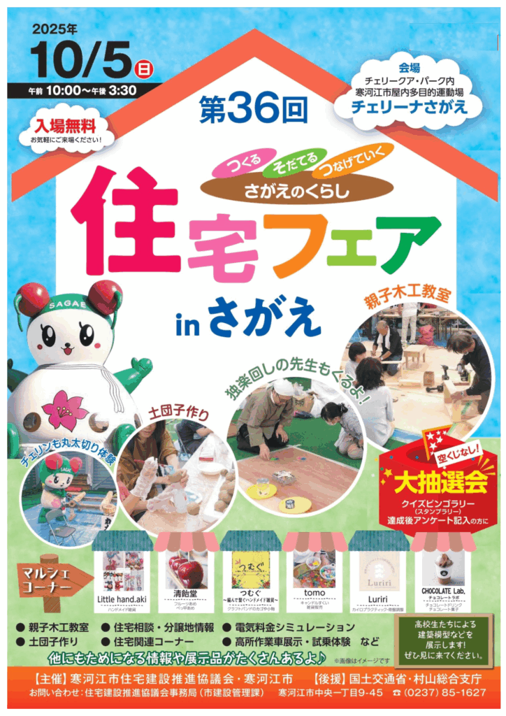 弊社が所属している寒河江市住宅建設推進協議会でも、10月5日㈰に【第36回 住宅フェア in さがえ】という寒河江の家づくりを皆さんに知ってもらうイベントを、寒河江市のチェリークアパークにある寒河江市屋内多目的運動場・チェリーナさがえを会場に開催します!