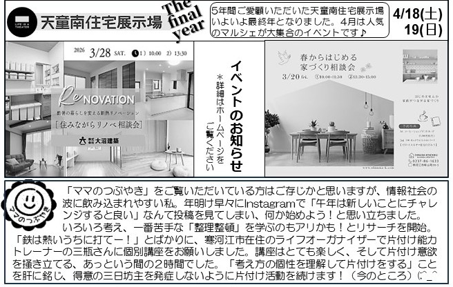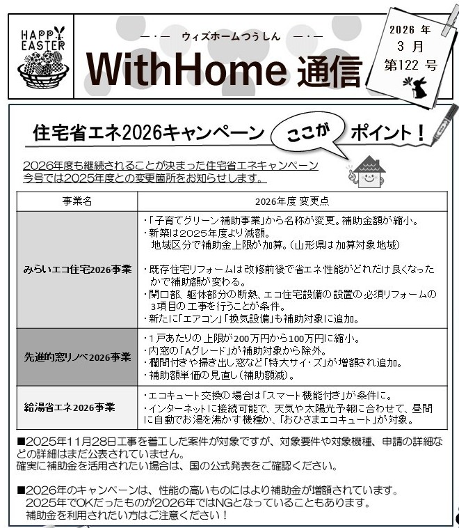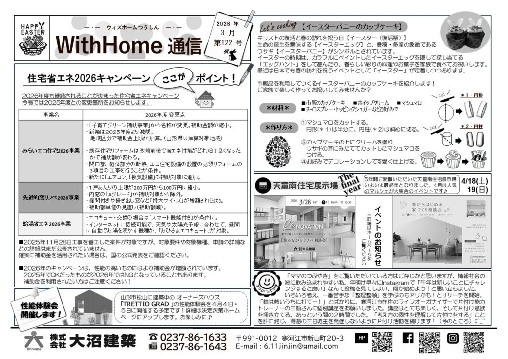 ウィズホーム通信 No.122 発行しました♪ 2026.03.08 - With Home通信 ブログトップ > ウィズホーム通信122号を発行しました。 山形新聞寒河江地区に折込チラシで配布しています。 配布されていない方は ぜひこちらでご覧ください♪ 122号では ・住宅省エネキャンペーン2026続報 ・大沼建築のイベント開催のお知らせ ・天童南住宅展示場イベントのお知らせ ・Let’s cooking ・ママのつぶやき を掲載しています。 キーワード検索 カテゴリー OHNUMAKENCHIKUの日々。 (60) With Home通信 (17) 技能五輪への道 (11) 暮らしのイイネ 👍 (6) 現場NEWS (52) アーカイブ 2026年(4件)3月(1件)ウィズホーム通信 No.122 発行しました♪2月(1件)適材適所1月(2件)ウィズホーム通信 No.121 発行しました♪2026年もよろしくお願いします!2025年(30件)11月(2件)owner’s house 完成見学会With Home 通信 No.120発行しました♪10月(5件)技能五輪全国大会終了しました!大工育成塾【暮らしを楽しむシンプルな家】#木工事【第36回住宅フェアinさがえ】終了しました第36回住宅フェア in さがえ9月(4件)技能五輪2025【強化訓練】「技能五輪全国大会」山形県選手団結団式【SW工法の家 性能体験会】レポートWith Home 通信 No.119発行しました♪8月(2件)【暮らしを楽しむシンプルな家】#建て方工事新築工事、着工!7月(1件)With Home 通信 No.118 発行しました♪6月(1件)ラベンダー貰ってくれませんか?5月(1件)With Home 通信 No.117 発行しました♪4月(3件)築30年自宅リフォーム工事 part.10築30年自宅リフォーム工事 part.9歓送迎会2025春🌸3月(3件)築30年自宅リフォーム工事 part.8【大谷畑の家】LIXILメンバーズコンテスト2024「エコロジー賞スーパーウォール部門」受賞With Home 通信 No.116 発行しました☆2月(3件)築30年自宅リフォーム工事 part.7築30年自宅リフォーム工事 part.6築30年自宅リフォーム工事 part.51月(5件)築30年自宅リフォーム工事 part.4築30年自宅リフォーム工事 part.3築30年自宅リフォーム工事 part.2With Home 通信 No.115 発行しました♪築30年自宅リフォーム工事がスタートしました!2024年(42件)12月(3件)「おしゃべりはずむ♪家事ラクZEHの家」お引渡しセレモニー今日の大工さんおしゃべりはずむ♪家事ラクZEHの家・完成見学会11月(1件)住みながらリノベ part510月(4件)足場が外れました!~おしゃべりはずむ♪暮らしやすい家事ラクZEHの家~オリジナル木製トンボ完成!『おしゃべりはずむ♪暮らしやすい家事ラクZEHの家』気密測定終わりましたご来場ありがとうございました♪9月(5件)おしゃべりはずむ♪暮らしやすい家事ラクZEHの家「構造性能体験会」住みながらリノベ part 4『おしゃべりはずむ♪暮らしやすい家事ラクZEHの家』手形式 & バースデーサプライズ☆『おしゃべりはずむ♪暮らしやすい家事ラクZEHの家』建て方工事『おしゃべりはずむ♪暮らしやすい家事ラクZEHの家』始動しました!8月(5件)住みながらリノベ part 3With Home 通信 No.113 発行しました♪【断熱リノベ】ページリニューアル♬夏季休業日のお知らせ住みながらリノベ part27月(2件)夏恒例!社内BBQI様邸リフォーム工事が始まりました6月(3件)YBC「サンデー5」が取材に来ました!今田君歓迎ランチ会WithHome通信 No.112発行しました5月(5件)SWまつり開催しました♪仲間が増えました!我が家のトイレリフォーム工事 vol.2笑顔いっぱいの一日日々精進!4月(4件)我が家のトイレリフォーム工事【With Home通信No.111】発行しました無事終了!棚卸在庫処分SALE今週末に開催!在庫処分セール3月(2件)「出会いに感謝」歓送迎会「春」が顔を出しました♪2月(5件)【ネコと暮らすアトリエのある家】完成記念セレモニー見学会、終了しました見学会折込チラシ♪ウィズホーム通信No.110発行しました【ネコと暮らすアトリエのある家】仕上工事🐾1月(3件)【断熱リノベ二世帯住宅】完成見学会 & 完成記念セレモニー新入社員紹介完成記念セレモニー【大谷畑の家】2023年(71件)12月(3件)【断熱リノベ2世帯住宅】進捗状況LIXIL住まいStudioオンラインツアーウィズホーム通信No.109発行しました11月(6件)【技能五輪への道】finalLIXILメンバーズコンテスト2023【エコロジー賞】を受賞しました!Christmasがいっぱい♪【大谷畑の家】外部足場が外れました。【技能五輪への道】vol.7【大谷畑の家】頬杖の特長10月(6件)👻ハロウィン🎃【技能五輪への道】vol.6【猫と暮らすアトリエのある家】躯体検査が行われました【技能五輪への道】vol.5With Home 通信 No.108 発行しました!【猫と暮らすアトリエのある家】手形板完成♬9月(9件)【技能五輪への道】vol.4【大谷畑の家】杉板の外壁居心地のよい庭を目指して!【技能五輪への道】Vol.3【猫と暮らすアトリエのある家】基礎工事が進んでいます♬【技能五輪への道】vol.2【大谷畑の家】BELS認証いただきました!【技能五輪への道】vol.1JICA(青年海外協力隊)メンバーさんが見学に来てくれました!8月(6件)【大谷畑の家】玄関ドア入りました♪国策対応アクションセミナー受講✍【断熱リノベ2世帯住宅】上棟式With Home 通信 No.107 発行しました♪【猫と暮らすアトリエのある家】地鎮祭今週末開催!【大谷