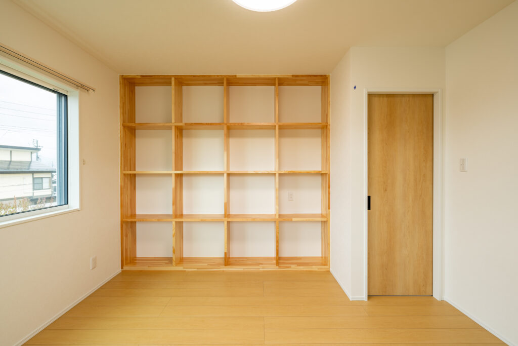 寝室の壁一面の造作本棚は、収納したい本のサイズを事前に測り